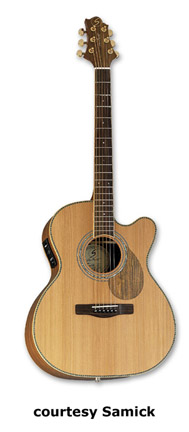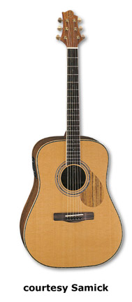 SAMICK | ACOUSTIC: RIO GRANDE SERIES | | D 15 E | - dreadnought body, solid cedar top, ovangkol sides and back, turquoise dyed maple trim, maple binding, three-per-side gold Grover tuners, Fishman Classic 4-Band EQ, available in Natural finish, mfg. 2000-03, 2006-present. |
