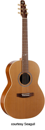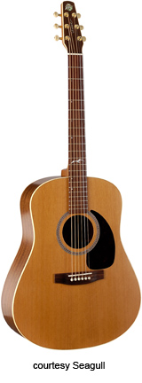 MOSAIC (MODEL 21802) | - full sized body, solid cedar top, solid mahogany back and sides, mahogany neck, 14/21-fret rosewood fingerboard with dove inlay, rosewood bridge, hand polished natural lacquer, case included, mfg. 2003-present. |