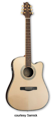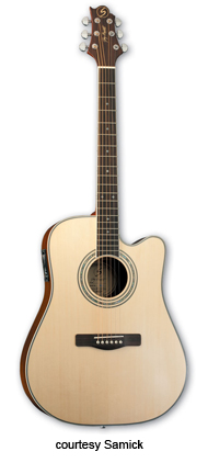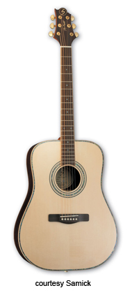 SAMICK | ACOUSTIC: SOLID WOOD SERIES | | ASDML1 | - dreadnought body, solid Sitka spruce top, solid mahogany back and sides, seven-ply binding, rosewood fingerboard with slotted square inlays, three-per-side Grover tuners, rosewood bridge, Natural finish, limited production, mfg. 2006-present. |