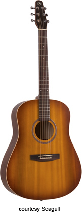 SEAGULL | ACOUSTIC: MISC. MODELS | | 25TH ANNIVERSARY MAHOGANY SPRUCE HG (MODEL 31313) | - dreadnought-style body, solid spruce top, solid mahogany back and sides, round soundhole, mahogany neck, Indian rosewood fingerboard, rosewood headstock overlay, three-per-side deluxe gold tuners with cream buttons, Indian rosewood bridge, commemorative certificate, 25th Anniversary headstock logo, available in High Gloss natural finish, new 2008. |
