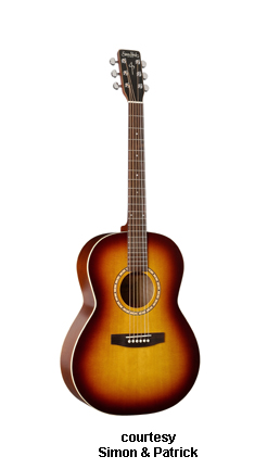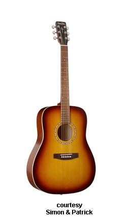 SIMON & PATRICK | ACOUSTIC: SONGSMITH SERIES | | SONGSMITH (MODEL 30088) | - dreadnought body style, select pressure tested solid cedar top, wild cherr back and sides, round soundhole with rings, cream body binding, Silver Leaf maple neck, 14/20-fret rosewood fingerboard with dot inlays, three-per-side chrome tuners, rosewood bridge, available in Varnish Burst semi-gloss finish, mfg. 2007-present. |