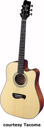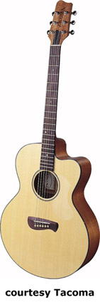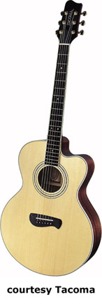 EM10CE2 CUTAWAY ELECTRIC | - single Florentine cutaway hollowbody, 3.25 in. deep, solid Sitka spruce top, solid mahogany back and sides, rosewood fingerboard with abalone dot position markers, rosewood bridge, tortoise bound neck and body, inlaid ivoroid logo on headstock, abalone rosette, Tacoma E2 Preamp system, available in Satin Natural finish, disc. |