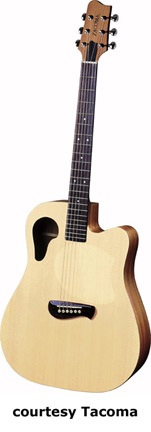 TACOMA | ACOUSTIC: ROADKING DREADNOUGHT SERIES | The Roadking Series feature the off center teardrop soundhole in a dreadnought body style. | RM6 | - dreadnought style body, same design as the Chief, Sitka spruce top, mahogany back and sides, sound hole on bass bout, rosewood fingerboard and bridge, unbound body, available in light satin finish, mfg. 2002-03. |