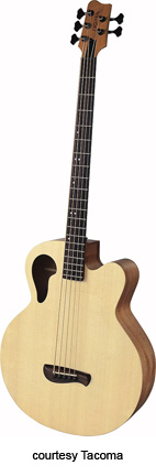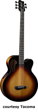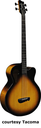 TACOMA | ACOUSTIC BASS: THUNDERCHIEF SERIES | The Thunderchief Bass series is just what it sounds. It is a bass version of the Chief series. All of these models have the soundhole in the upper bass bout. All models are available in fretless configuration for no additional cost (suffix F). | CB10C THUNDERCHIEF CUTAWAY BASS (NO. 038-1200) | - single cutaway chief style body, Sitka spruce top, mahogany back and sides, rosewood fingerboard, unbound body, two-per-side tuners, mfg. 1999-present. |