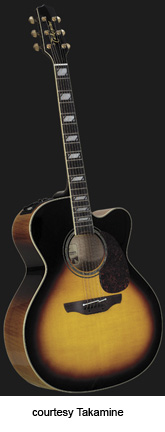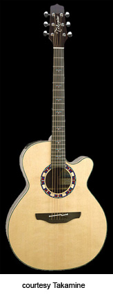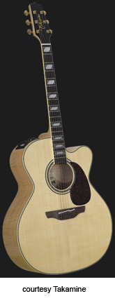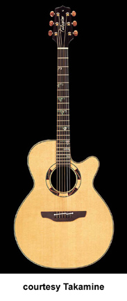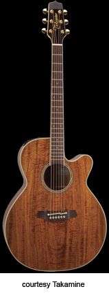 EF-508KC | - single cutaway NEX-style figured koa body, round soundhole with abalone rosette, bound body, bound rosewood fingerboard with abalone snowflake inlays, black headstock overlay with three-per-side gold tuners, rosewood bridge, Takamine Palethetic pickup, CT4B2 preamp/electronics, available in Natural finish, mfg. 2007-present. |