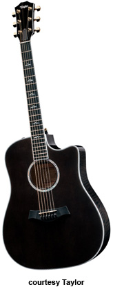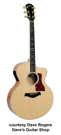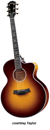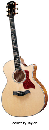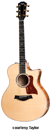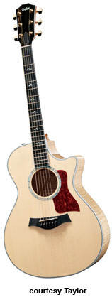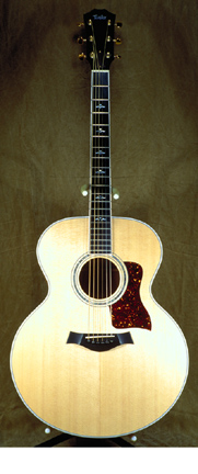 616 CE | - single cutaway Grand Symphony (GS) body style, Sitka spruce top, Big Leaf maple back and sides, round soundhole with abalone rosette, white plastic top and back binding, multi-ply top inlay, Hard Rock maple neck, 14/20-fret bound ebony fingerboard with pearl leaf pattern inlays, Indian rosewood bound headstock overlay with pearl logo, three-per-side gold tuners, ebony bridge, tortoise pickguard, Taylor Expression electronics, available in Natural Gloss finish, 25.5 in. scale, hardshell case included, new 2008. |