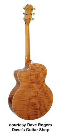 615 | - jumbo body, solid spruce top, round soundhole, tortoise pickguard, 3-stripe bound body/rosette, solid maple back/sides, mahogany neck, 14/20-fret bound rosewood fingerboard with pearl dot inlay, rosewood bridge with black pins, rosewood veneer on peghead, 3-per-side gold tuners, available in Natural finish, disc. 1998. |