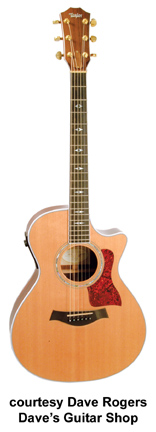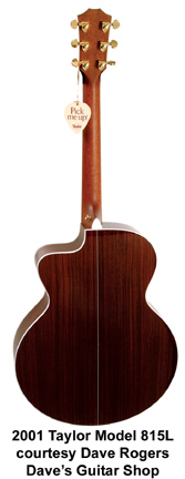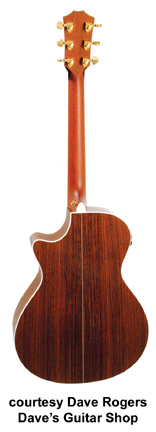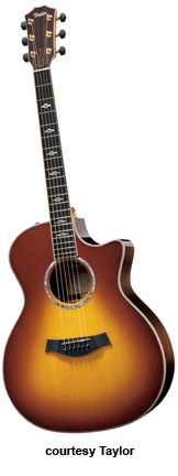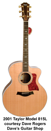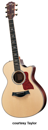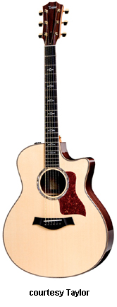 816 CE | - single cutaway Grand Symphony (GS) body style, Sitka spruce top, Indian rosewood back and sides, round soundhole with abalone rosette, maple top and back binding with W/B inlays, Tropical American mahogany neck, 14/20-fret maple-bound ebony fingerboard with Pearl 800 Series inlays, Indian rosewood maple-bound headstock overlay with pearl logo, three-per-side gold tuners, ebony bridge, tortoise pickguard, Taylor Expression electronics, available in Natural Gloss finish, 25.5 in. scale, hardshell case included, new 2008. |