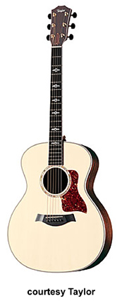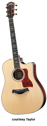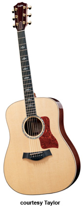 TAYLOR | ACOUSTIC: 800 SERIES | The Taylor 800 series are referred to as "the descendants of Bob Taylor's original design." These deluxe models feature Indian rosewood back and sides, scalloped bracing (on 6-string models), abalone soundhole rosette, and pearl "Progressive Diamond" fretboard inlay. | 810 | - dreadnought body, solid Sitka spruce top, round soundhole, tortoiseshell pickguard, three-stripe bound body, abalone rosette, Indian rosewood back/sides, mahogany neck, 14/20-fret bound rosewood fingerboard with pearl snowflake inlay, rosewood veneer on bound peghead w/ pearl logo inlay, three-per-side gold tuners, rosewood bridge with black abalone dot pins, available in Natural finish, current mfg. |