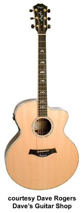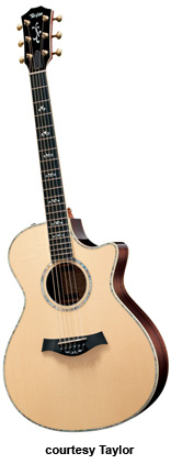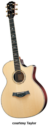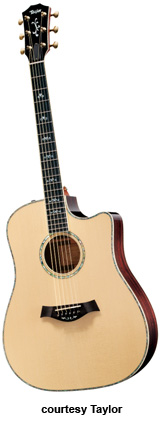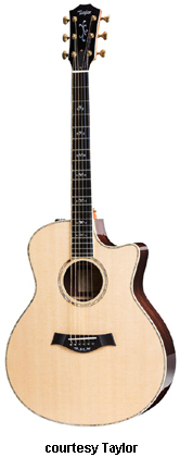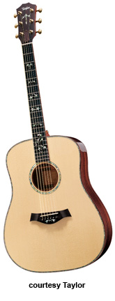 TAYLOR | ACOUSTIC: 900 SERIES | The deluxe 900 series models feature Engelmann spruce tops, Indian rosewood back and sides, scalloped bracing (on the 6-string models), abalone top edging combined with rosewood binding, distinct abalone soundhole rosette, and the abalone and pearl "Cindy" design fingerboard inlays. | 910 | - dreadnought body, solid Engelmann spruce top, round soundhole, tortoiseshell pickguard, abalone edge inlay/rosewood body binding, abalone rosette, maple back/sides/neck, 14/20-fret ebony fingerboard with abalone stylized inlay, rosewood peghead veneer with abalone stylized T/logo inlay, three-per-side gold tuners, ebony bridge with black abalone dot pins, available in Natural finish, current mfg. |