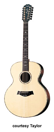 955 12-STRING | - 12-string configuration, jumbo body, solid spruce top, round soundhole, tortoiseshell pickguard, wood bound body, abalone rosette, maple back/sides/neck, 14/20-fret ebony fingerboard with abalone stylized inlay, rosewood veneer with abalone stylized T/logo inlay on peghead, six-per-side gold tuners, ebony bridge with black abalone dot pins, Natural finish, disc. 2006. |