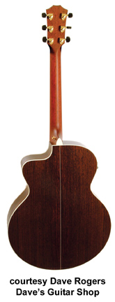 915 | - jumbo body, solid spruce top, round soundhole, tortoise pickguard, wood bound body, abalone rosette, maple back/sides/neck, 14/20-fret ebony fingerboard with abalone stylized inlay, ebony bridge with black abalone dot pins, rosewood veneer with abalone stylized T/logo inlay on peghead, 3-per-side gold tuners, available in Natural finish, disc. 1992. |