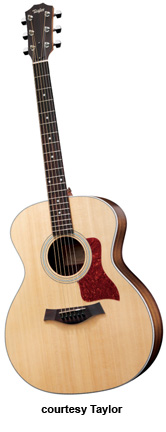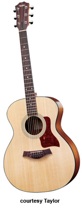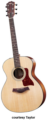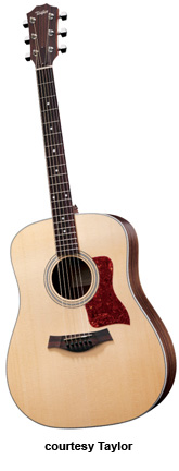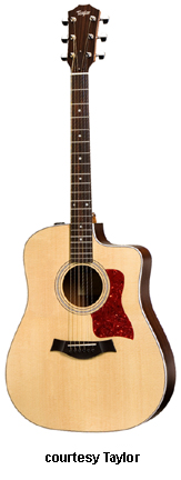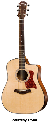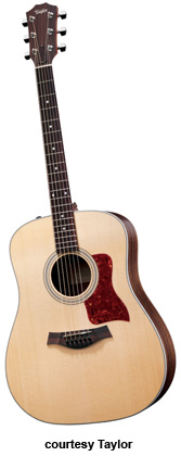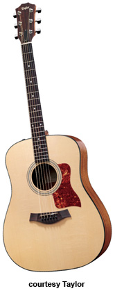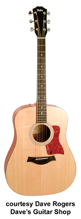 TAYLOR | ACOUSTIC: 100/200 SERIES | | 110 | - dreadnought style, Sitka spruce top, sapele laminated back and sides, Tropical American Mahogany neck, 20-fret ebony fingerboard with dot inlay, black plastic binding, chrome hardware, varnish natural finish, mfg. 2004-present. |