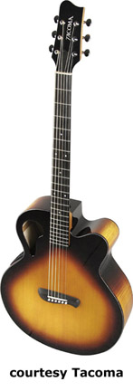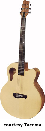 TACOMA | ACOUSTIC BARITONE: THUNDERHAWK SERIES | The Thunderhawk Barione Series feature the off center tear drop soundhole, are tuned to baritone BEADGB, and have a 29 in. scale. | BM6C THUNDERHAWK CUTAWAY (NO. 038-1000) | - baritone configuration, single smooth cutaway body, spruce top, mahogany back and sides, teardrop soundhole on bass bout, three-per-side tuners, mfg. 2004-present. |