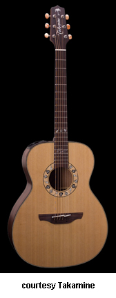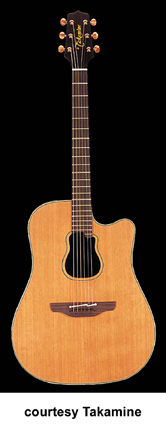 GARTH BROOKS GB-7C | - single cutaway dreadnought body, solid cedar top, rosewood back and sides, guitar-shaped soundhole that extends to fingerboard, concentric rings rosette, rosewood fingerboard, three-per-side tuners, rosewood bridge, CT-48 electronics, gold hardware, available in Natural finish, mfg. 1996-present. |