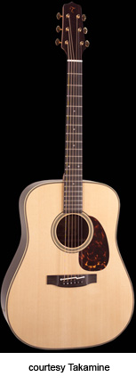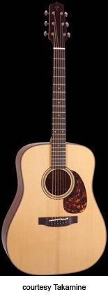 EF340SBG | - dreadnought style, solid spruce top, solid mahogany back and sides, round soundhole with concentric rings rosette, 14/20-fret ebony fingerboard with pearl dot inlays, three-per-side open gear antique nickel tuners, rosewood bridge, tortoiseshell pickguard, TLD Line Driver preamp/electronics, available in Gloss Natural finish, mfg. 2007-present. |
