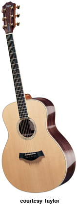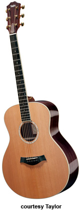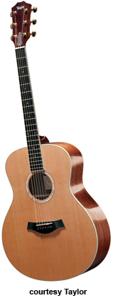 TAYLOR | ACOUSTIC: GS SERIES | The GS body shape is an original by Bob Taylor. It is similar to the Grand Auditorium with a wider waste and stretched top-end. | GS 5/GS 6/GS 7/GS 8 | - GS body style, solid cedar top with solid mahogany back and sides (GS 5), solid Sitka spruce top with solid maple back and sides (GS 6), solid cedar top with Indian rosewood back and sides (GS 7), or a solid spruce top with solid Indian rosewood back and sides (GS 8), round soundhole with abalone rosette, ivoroid body and neck binding, 14/20-fret rosewood fingerboard with abalone dot inlays, rosewood headstock veneer with three-per-side gold tuners, ebony bridge, available in Natural finish, mfg. 2006-present. |