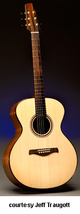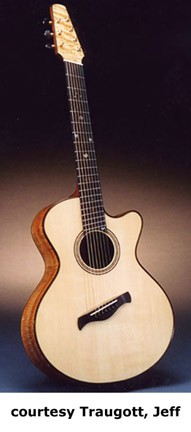TRAUGOTT, JEFF | Instruments currently built in Santa Cruz, CA since 1991. | Luthier Jeff Traugott builds a line of high-end acoustic steel string guitars and produces twelve guitars a year. He focuses on high-level craftsmanship, as well as a clean, sophisticated sense of design. Jeff Traugott's Guitars have a reputation for excellent projection and clear, bell-like tones up and down the neck. Traugott guitars come in four basic models and a variety of woods but Traugott is especially known for using old growth, high grade Brazilian Rosewood back and sides and German spruce tops. For more information on model specification, pricing, and availability, please contact Jeff Traugott directly (see Trademark Index). | | ACOUSTIC |
