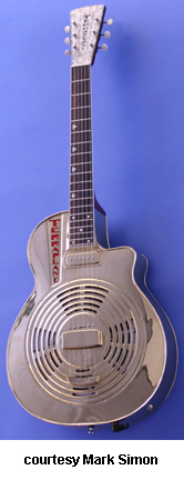 TERRAPLANE RESONATOR GUITAR CO. | Instruments currently built in Bridgewater, NJ since 2004. | Luthier Mark Simon began building guitars in the 1970s, and he founded Terraplane in 2004 to build metal-bodied resonators. Simon uses brass and nickel-silver metals, National-style or Dobro-style spider cones, and Jason Lollar pickups in his construction. Simon also offers some non-traditional features in his resonators including a single cutaway and a patent-pending string anchoring system with no actual taipliece. Simon has built instruments for Johnny Winter, Sonny Landreth, Arlen Roth, and Cindy Cashdollar. His resonators start at $7,000. Simon also offers a line of tube amplifiers designed specifically for use with his resonators. For more information, visit Terraplane's website or contact Simon directly. | |