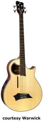 WARWICK | ACOUSTIC BASS | | ALIEN | - single sharp cutaway concert style, laminated spruce top, laminated ovankol (disc. 1994, 2008-present) or laminated rosewood (2001-05) back/sides, asymmetrical soundhole located in upper bass bout with ovangkol soundhole cap, rosewood thumb rest, wood body binding, two-piece mahogany neck with wenge center strip, 24-fret wenge or fretless ebony fingerboard, ebony headstock overlay with pearl W inlay, two-per-side chrome tuners, wenge or ebony bridge, metal tailpiece, Fishman Prefix Plus piezo pickup and electronics, available in Natural Satin finish, disc. 1994, 2001-05, and 2008-present. |