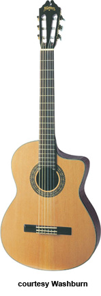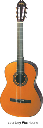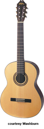 C111S FLAMENCO | - classical Flamenco design, solid spruce top, spruce back and sides, round soundhole with classical rosette, rosewood body binding, mahogany neck, 12/19-fret rosewood fingerboard, slotted headstock with black overlay and Washburn logo, three-per-side open-style gold tuners, rosewood tied bridge, available in Natural finish, case included, new 2008. |