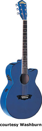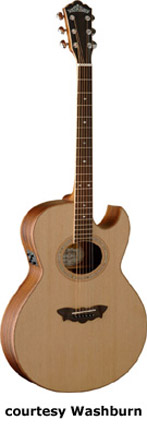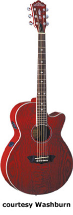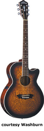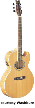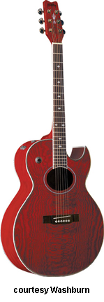 EA17 (SECOND VERSION) | - single sharp cutaway deep body, ash top, quilted ash back and sides, oval soundhole with single ring rosette, multi-ply top and back binding, mahogany neck, 14/22-fret bound rosewood fingerboard with pearl diamond inlays, quilted ash matching finish headstock overlay with small Washburn logo and torch inlay, three-per-side chrome tuners, rosewood bridge, B-Band A15 electronics, available in Natural or Trans. Red finish, case included, new 2008. |