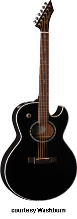 EA21HM | - single sharp cutaway thin body, mahogany top, back, and sides, oval soundhole with large abalone pearl rosette, multi-ply top and back binding, abalone pearl top border, mahogany neck, 14/21-fret rosewood fingerboard with pearl star inlays, hockey stick-style headstock with black overlay and Washburn logo, six-on-one-side chrome Grover Exclusive tuners, rosewood bridge, B-Band A15 electronics, Buzz Feiten Tuning System, available in Black, White, or Wine Red finish, case included, new 2008. |