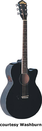 EA44 MONTEREY | - single sharp cutaway thin style, solid cedar top, oval soundhole, bound body, three-stripe purfling/rosette, rosewood back/sides, mahogany neck, 14/20-fret bound rosewood fingerboard with pearl diamond inlay, rosewood bridge with white black pins, bound peghead with rosewood veneer, three-per-side chrome tuners with pearl buttons, acoustic bridge pickup, Washburn 3200/EQ300/Equis II electronics, available in Black, Natural, or Tobacco Sunburst finish, mfg. 1979-1985, 1987-89, 1992-94. |