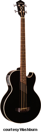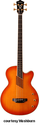 AB40 FIRST VERSION | - single round cutaway deep body, arched solid spruce top, diagonal sound channels (soundhole), bound body, quilted ash back/sides, multi-layer maple neck, 16/24-fret bound ebony fingerboard with pearl dot inlay, ebonized rosewood bridge with brass insert, bound peghead with pearl Washburn logo and stylized inlay, two-per-side tuners, gold hardware, active electronics, three knobs (v, 2 tone), Equis II bass preamp system, available in Natural or Tobacco Sunburst finish, mfg. late 1980s-1993. |