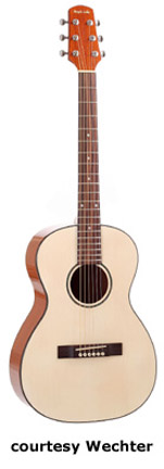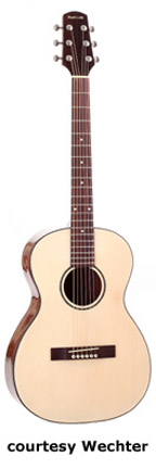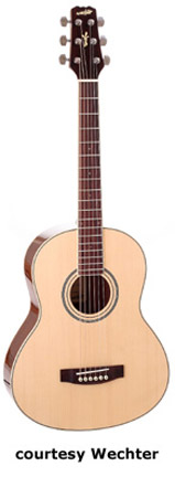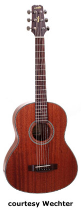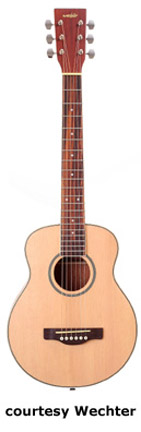 1700 TRAVEL GUITAR | - miniature body, solid spruce (Model 1705, 1710, 1730, 1735) or mahogany (Model 1720) top, mahogany (Model 1705, 1710, and 1720), rosewood (Model 1730), or lacewood (new 2007, Model 1735) back and sides, multiple black and white binding, abalone rosette, nato neck, 14/20-fret rosewood fingerboard with dot inlay, rosewood bridge, available in Natural finish, 23.3 in. scale, mfg. 2006-present. |