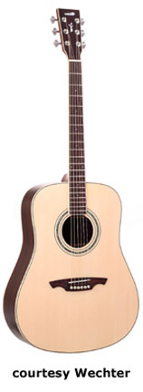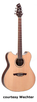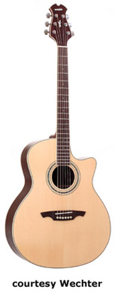 WECHTER GUITARS | ACOUSTIC: MISC. MODELS | The Pathmaker Standard has a dual cutaway acoustic body, solid Sitka spruce top, solid mahogany or rosewood back/sides, round soundhole, abalone rosette, wood binding, mahogany neck, 19/22-fret rosewood fingerboard with offset abalone dot inlay, three-per-side tuners, rosewood peghead veneer with mother-of-pearl logo inlay, rosewood bridge with white bridgepins, tortoise pickguard, Fishman Prefix + system, available in Natural gloss finish. With mahogany back and sides MSR is $1,899. With rosewood back and sides MSR is $2,000. This model is also available in a Satin gloss finish. List price includes a hardshell case. The Pathmaker Elite Nylon String is similar to the Pathmaker Standard, except features a nylon string configuration, available in Natural gloss finish With mahogany back and sides MSR is $2,049. With rosewood back and sides MSR is $2,149. This model is also available in a Satin gloss finish. List price includes a hardshell case. The Pathmaker Starburst is similar to the Pathmaker Standard, except features white ABS body binding, available in Tobacco Brown Starburst finish With mahogany back and sides MSR is $2,099. With rosewood back and sides MSR is $2,199. The Wechter Elite 9000 Series are currently offered as their U.S. models. Prices start at $3,000. An acoustic bass is also available. | 5700 SERIES | - dreadnought (Model 5711), grand auditorium cutaway (Model 5712C), jumbo (Model 5714), parlor (Model 5713), or Pathmaker (Model 5730) body style, solid spruce top, rosewood back and sides, black and white binding, abalone rosette, nato neck, 14/20-fret rosewood fingerboard with dot inlay, three-per-side chrome tuners, rosewood bridge, available in Natural Open-Pore finish, 25.5 in. scale, mfg. 2006-present. |