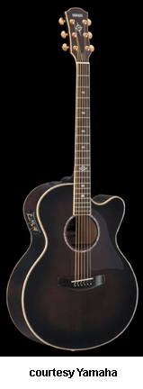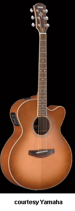 YAMAHA | ACOUSTIC ELECTRIC: COMPASS SERIES | Yamaha introduced their Compass (CPX) Series in 1998. The Compass Series featured a single smooth cutaway body that was a bit smaller than a regular full-sized jumbo acoustic and Yamaha used their two-way piezo/mic pickup electronics. The CPX 15 handcrafted series came in two regular versions (CPX 15/CPX 15A and the CPX 15CM) as well as four guitars named after the four points of the compass. Each direction represented a certain area of the world and each guitar had unique appointments in body woods, rosettes, and fingerboard inlays. In 2006, Yamaha introduced an entirely new line of Compass models that had three digit model numbers. | CPX 5 | - single smooth cutaway jumbo Compass-style body, spruce top, nato back and sides, round soundhole with multi rings rosette, three-ply body binding, nato neck, 14/20-fret rosewood fingerboard with pearl dot inlays, matching finish headstock overlay with logo and Compass inlays, three-per-side chrome tuners, rosewood bridge, no pickguard, System 39 one-way piezo bridge pickup, three-band EQ, volume, AMF, and mid-shape button controls, available in Black, Yellow Natural, Trans. Blue Burst, or Violin Sunburst finish, 25.625 in. scale, mfg. 1999-2006. |