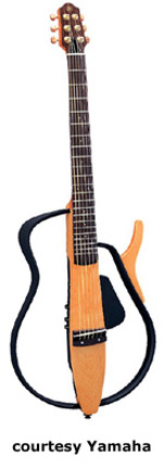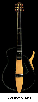 YAMAHA | ACOUSTIC ELECTRIC: SILENT GUITAR SERIES | The Silent Guitar by Yamaha is a guitar designed to travel and be a silent instrument that you can plug headphones in directly to hear. There are onboard effects yet the guitar can be plugged in to external equipment to be amplified. The body is also very light with only the outline of the body making up the majority of the guitar. | SLG100N | - nylon-string configuration, single cutaway maple body, detachable black frame, mahogany neck, 12/19-fret rosewood fingerboard with no inlays, slotted headstock with rosewood overlay and Yamaha logo, three-per-side open-style gold tuners, rosewood tied bridge, B-Band piezo pickup and electronics with volume, bass, and treble knobs, reverb switch, headphone jack with on/off switch, aux. in line with level control, line out jack, available in Natural finish, gig bag included, mfg. 2002-present. |