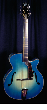 JAZZ (16 IN. OR 17 IN. BODY) | - hand graduated Sitka spruce top, curly maple back and sides, two-piece laminated curly maple neck, two f-holes, 22-fret bound ebony fingerboard with pearl diamond inlay, ebony head veneer/bridge, ebony/gold-plated brass hinged tailpiece, mother-of-pearl truss rod cover, black/white body binding, three-per-side gold-plated Schaller tuners, available in high gloss nitrocellulose finish, current mfg. |