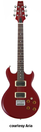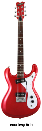 ARIA/ARIA PRO II | ELECTRIC: REISSUE SERIES | | CS-300 | - slightly offset symmetrical double cutaway alder body, bolt-on maple neck with a heel-less joint, 22-fret rosewood fingerboard with pearl dot inlays, matching finish headstock overlay with "Aria" and "Cardinal Series" logos, three-per-side tuners, FB-1 hard tail bridge with individual saddles, two Duncan Designed exposed zebra humbucker pickups, four knobs (two v, two tone), three-way pickup switch, chrome hardware, available in Black, Blue, or Red finish, 24.75 in. scale, mfg. 2008-present. |