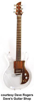 ADA6 DAN ARMSTRONG GUITAR REISSUE | - symmetrical double cutaway clear acrylic polymer body, bolt-on maple neck, 24-fret rosewood fingerboard with dot inlays, rosewood headstock overlay with three-per-side tuners, rosewood bridge with compensated brass saddles, rosewood simulated pickguard with inscribed (Dan Armstrong Ampeg), single switchable pickup (guitar comes with two Kent Armstrong pickups including a Dual Blade humbucker and a Vintage Rock Treble), two knobs (v, tone), three-way pickup/control switch, nickel hardware, 24.75 in. scale, hardshell Blue Check case included, mfg. 2006-present. |
