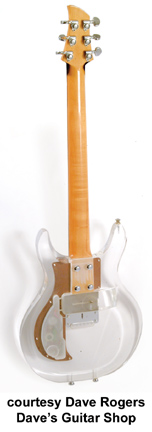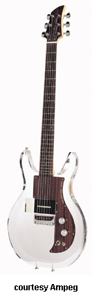 AMPEG/DAN ARMSTRONG AMPEG | ELECTRIC: DAN ARMSTRONG/AMG "SEE-THRU" SERIES | In 1998, Ampeg reissued the infamous Dan Armstrong guitars and basses. These new models were based on the same design as the old models along with a new guitar with AAA grade maple, the AMG1. By 2002, the whole line of guitars and basses was discontinued in the Ampeg line, but the Dan Armstrong model was reissued once again in 2006. | ARMG-2 DAN ARMSTRONG | - clear lucite body, bolt-on maple neck, 24-fret rosewood fingerboard, Schaller (or Grover) tuners, adjustable straight bar bridge, one (interchangeable) pickup, volume/tone controls, 24.5 in. scale, mfg. 1969-1971. |