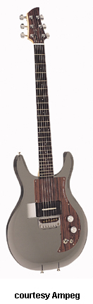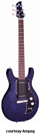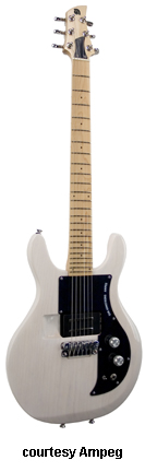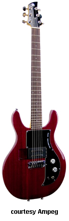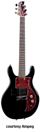 AMG100 | - symmetrical double cutaway Dan Armstrong-style light weight alder (Black finish), mahogany (Cherry finish), or swamp ash (Blonde finish) body, bolt-on maple neck, 24-fret maple fingerboard with small black dots (Blonde finish) or rosewood fingerboard with small white dots (Black or Cherry finish), three-per-side Grover tuners, adj. bridge with roller saddles, black pickguard (Blonde or Cherry finish) or tortoise pickguard (Black finish) with "Dan Armstrong Ampeg" enscribed, interchangeable Dual Blade Sustain Treble and Single Coil Rock Treble pickups (only one can be used at a time), two knobs (v, tone), three-way pickup switch, nickel hardware, available in Black, Blonde, or Cherry finish, 24.75 in. scale, hardshell case included, new 2008. |