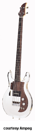 ADA4 DAN ARMSTRONG BASS REISSUE | - symmetrical double cutaway see-thru thin acrylic body, bolt-on maple neck, 24-fret rosewood fingerboard with small pearl dot inlays, rosewood headstock overlay, two-per-side Grover tuners, rosewood bridge with compensated brass saddles, rosewood pickguard with "Dan Armstrong Ampeg" enscribing, interchangeable Stacked Coil Bright Bass and Deep Bass pickups (only one pickup can be used at a time), two knobs (v, tone), two-way tone switch, nickel hardware, 30 in. scale, new 2008. |