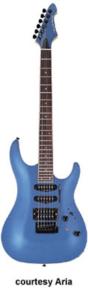 MAC-35 | - double cutaway, alder carved top, maple bolt-on neck, rosewood fingerboard with pearl dot inlay, 24 frets, matching color headstock, two single coil/one humbucker pickups, five-way selector and coil tap switches, two knobs (v, tone), VFT-1 Tremolo unit, chrome hardware, available in Matt Metallic Black, Metallic Blue, Metallic Burgundy, or Gun Metal finish, 25.5 in. scale, mfg. 2003-05. |
