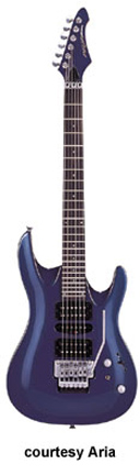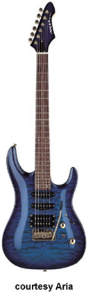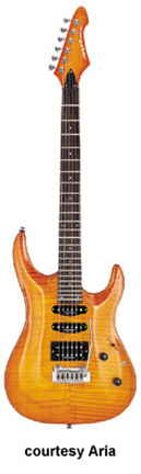 MAC-60 | - double cutaway, flamed maple carved top, alder body, maple bolt-on neck, rosewood fingerboard with pearl dot inlay, 24 frets, matching color headstock, two single coil/one humbucker Seymour Duncan pickups, five-way selector and coil tap switches, two knobs (v, tone), VS-50K Tremolo unit, chrome hardware, available in Amber Natural or See-Through Blue finish, 25.5 in. scale, mfg. 2000-present. |