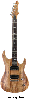MAC-EXO | - offset double cutaway Strat-style alder body, arched spalted maple top, set maple neck, 24-fret rosewood fingerboard with lightning bolt inlays, spalted maple headstock overlay, six-on-one-side tuners, tune-o-matic bridge, STB, two Seymour Duncan Dimebucker SH-13 tuners, two metal knobs (v, tone), three-way pickup switch, chrome hardware, available in Natural finish, 25.5 in. scale, mfg. 2008-present. |