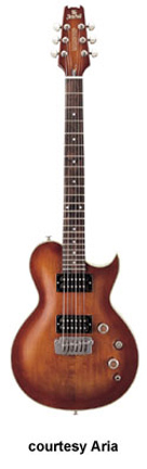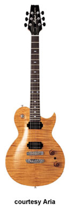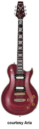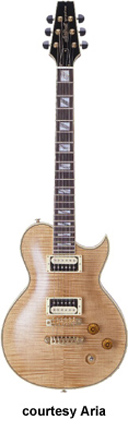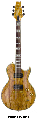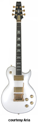 PE-SUPRA | - single sharp cutaway mahogany body, carved maple top, multi-ply body binding, set mahogany neck, 22-fret bound ebony fingerboard with pearl block inlays with green triangles, black headstock overlay with "Aria Pro II" logo and pearl bird inlay, three-per-side tuners, double locking Kahler hybrid tremolo bridge, two original Classic Power covered humbucker pickups, four knobs (two v, two tone), three-way switch, gold hardware, available in Pearl White finish, 24.75 in. scale, mfg. 2008-present. |