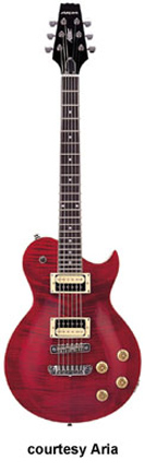 PE 1000 | - single sharp cutaway mahogany body, bound curly maple top, set-in maple neck, 22-fret bound rosewood fingerboard with abalone/pearl block inlay, bridge/stop tail piece, 3-per-side tuners, gold hardware, 2 humbucker pickups, 2 volume/2 tone controls, available in See-Through Blue, See-Through Red, or Vintage Sunburst, mfg. 1991-92. |