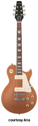 PE-90 | - single sharp cutaway mahogany body with a carved top, set mahogany neck, 22-fret bound rosewood fingerboard with pearl trapezoid inlays, black headstock overlay with logo, three-per-side tuners, original design SPT bridge, original design QH tailpiece, raised cream pickguard, two Duncan Designed P-90 pickups, four knobs (two v, two tone), three-way switch, chrome hardware, available in Metallic Gold finish, 24.75 in. scale, mfg. 2008-present. |