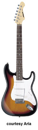 STG 003 | - offset double cutaway hardwood body, white pickguard, bolt-on maple neck, 22-fret rosewood fingerboard with white dot inlay, vintage style tremolo, six-on-one-side tuners, chrome hardware, three single coil pickups, three knobs (v, two tone), five-way switch, available in 2-Tone Sunburst, 3-Tone Sunburst, Aged Sunburst, Black, Blue, Candy Apple Red, Metallic Blue, Metallic Gold, Metallic Silver, Red, Salmon Pink, Sonic Blue, Surf Green, or White finish, 25.5 in.scale, mfg. 1996-present. |