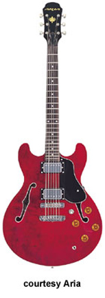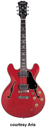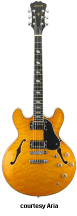 TA 1300 (TA DLX) | - double rounded cutaway semi-hollow style, sycamore top/back/sides, bound body, bound f-holes, raised bound tortoise pickguard, mahogany neck, 22-fret bound ebony fingerboard with abalone/pearl split block inlay, tune-o-matic bridge/stop tailpiece, bound peghead with pearl Aria Pro II logo and dove inlay, 3-per-side tuners, gold hardware, 2 humbucker pickups, 2 volume/tone controls, 3-position switch, available in Brown Sunburst or Vintage Sunburst finishes, mfg. 1991-92. |