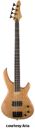 AVB 45 | - offset double cutaway alder body, bolt-on maple neck, 24-fret rosewood fingerboard with pearl oval inlay, fixed bridge, four-on-one-side tuners, black hardware, P/J-style pickups, volume/treble/bass/balance controls, active electronics, available in Natural, See-Through Blue, or See-Through Red finish, mfg. 1994-2002. |