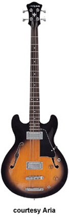 ARIA/ARIA PRO II | ELECTRIC BASS: THINLINE ACOUSTIC (TA) SERIES | | TAB-60 | - double rounded cutaway, mahogany hollow-body, maple bolt-on neck, 20-fret rosewood fingerboard, black headstock, 2-per-side tuners, black pickguard, 2 humbucker pickups, four knobs (2v, 2tone), pickup selector switch, chrome hardware, available in Brown Sunburst or Wine Red finishes, mfg. 2000-03. |