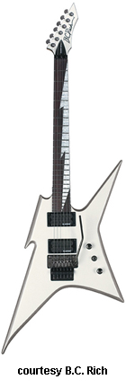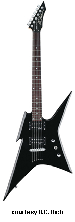 IRONBIRD ONE | - Explorer-style basswood body with a long pointed lower bass bout and upper treble bout, beveled edges, bolt-on maple neck, 24-fret rosewood fingerboard with dot inlays, hockey stick-style headstock with black overlay, six-on-one-side tuners, tune-o-matic bridge, STB, two B.C. Rich exposed humbucker pickups, two knobs (v, tone), three-way pickup switch, chrome hardware, available in Onyx black finish, 24.625 in. scale, mfg. 2008-present. |